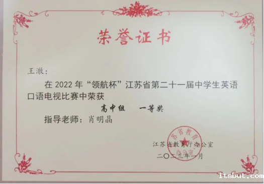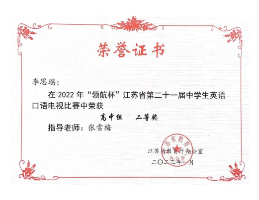 在第二十一届“领航杯”江苏省中学生英语口语电视比赛中,我校学子经过层层角逐,斩获佳绩。高一14班王澈获一等奖,高一17班李思瑶(撷秀高中)获二等奖!向获奖学生向以上获奖同学表示热烈祝贺!
