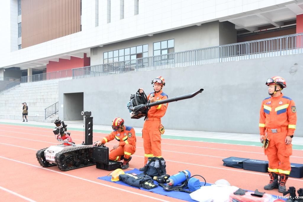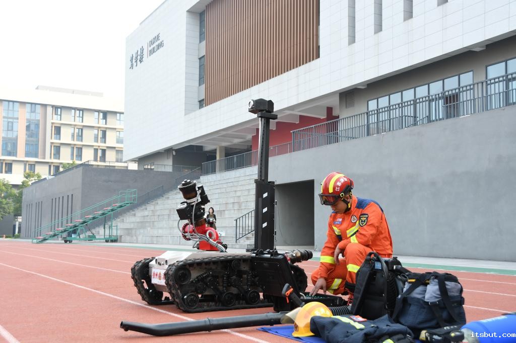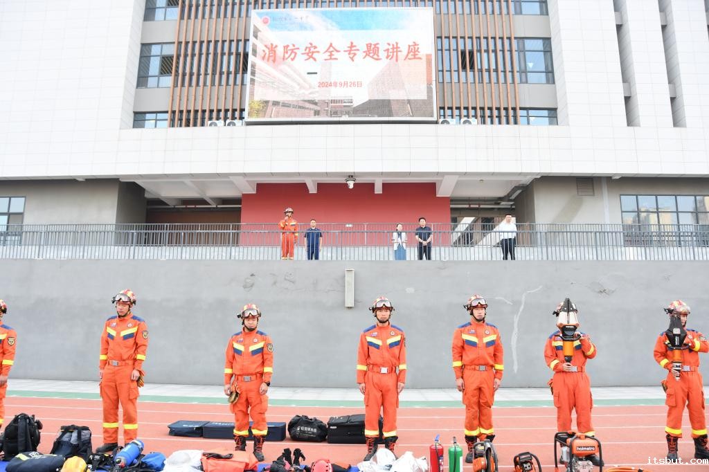 集合完毕,徐州市大龙湖旅游度假区太行路消防救援站站长韩龙瑞对全校师生进行消防安全知识培训。消防员向同学们展示并逐一介绍消防设备,消防机器人、灭火战斗服全套、空气呼吸器、防化服、水域救援浮力背心、湿式水域救援服、隔热服、灭火器、无齿锯、机动链锯、液压破拆工具组、排烟机,以及消防车水炮出水。