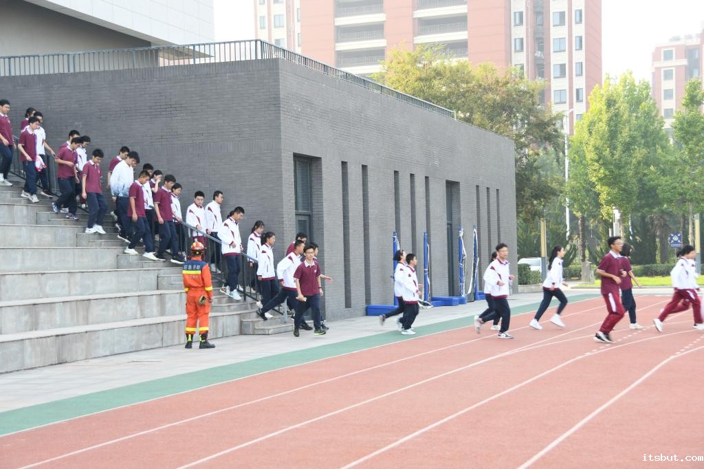 “校园发现火灾险情,请全体师生立即疏散”伴着警报声,广播里突然传来险情广播,各班班主任及各年级处长立即到位,组织学生有序疏散。全体学生按紧急疏散路线,弯着腰、捂口鼻,以最快的速度有序撤离教学楼,集合到操场安全区域,各班立即清点人数,并向主席台负责人报告疏散情况。