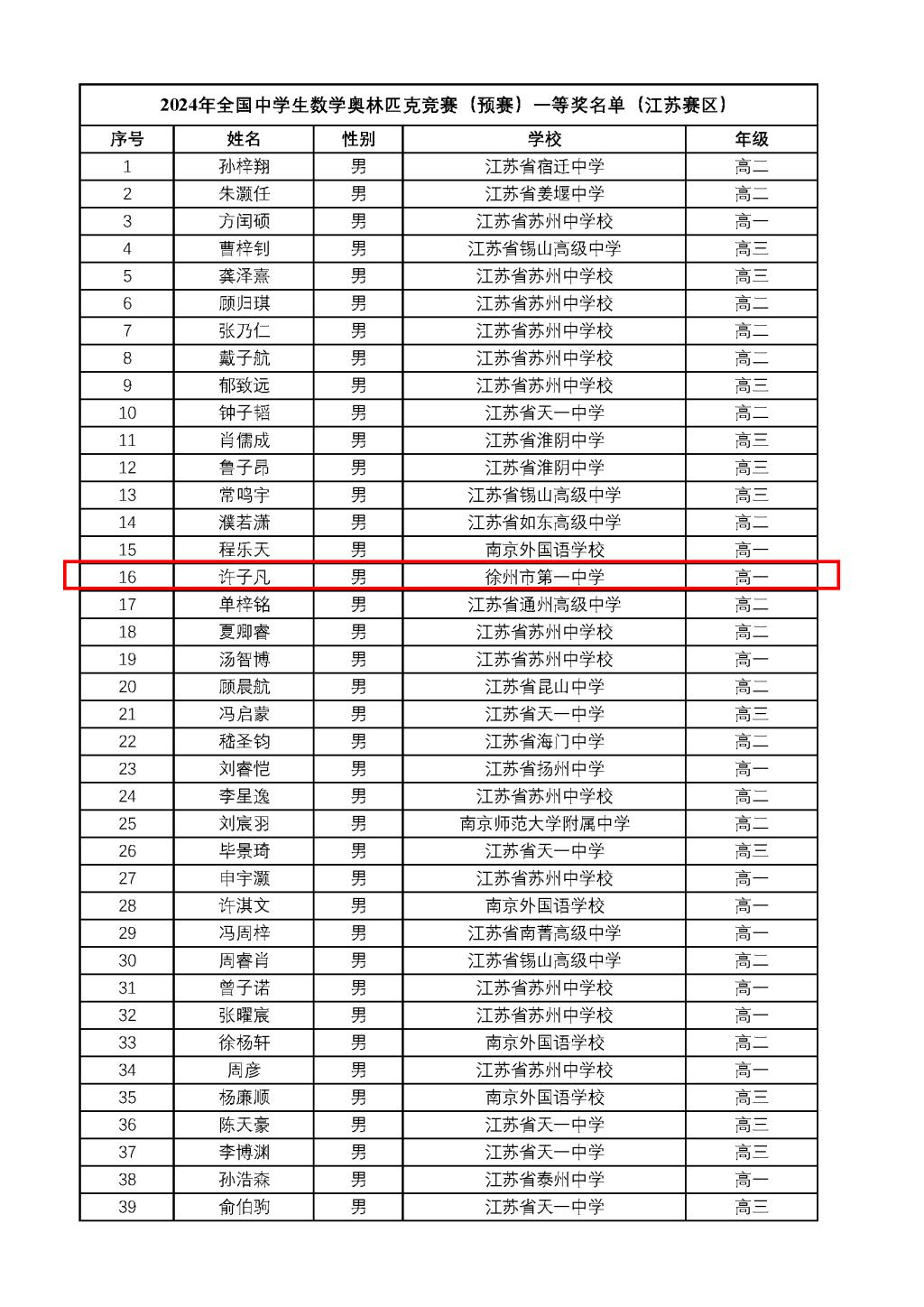 日前,中国数学会公布了2024全国中学生数学奥林匹克(预赛)江苏赛区一等奖和省队名单,betway总部3人获赛区一等奖(国一),许子凡同学以低年级身份入选省队。