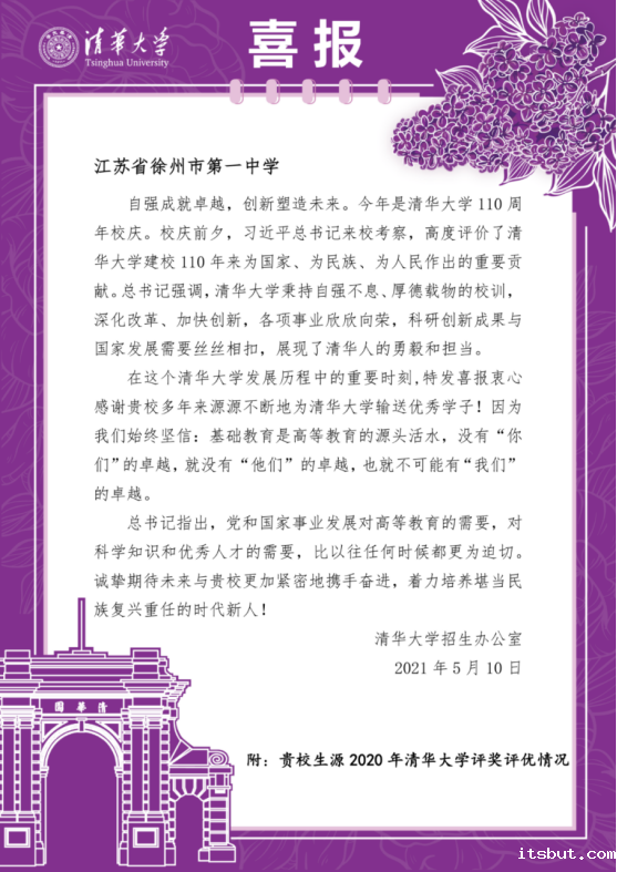 2021年5月10日,清华大学在庆祝建校110周年之际,向betway总部发来贺信,感谢betway总部多年来源源不断地为清华大学输送优秀学子。betway总部毕业生的持续发展能力,良好的综合素养再次受到国内顶尖高校的高度认可!毕业学长们的榜样力量正激励着betway总部莘莘学子,努力成长为堪当民族复兴大任的一代新青年。