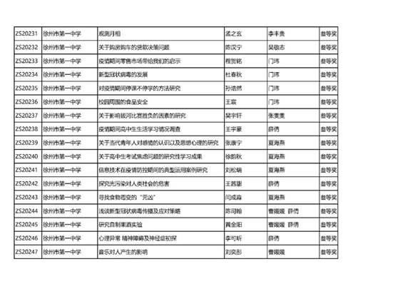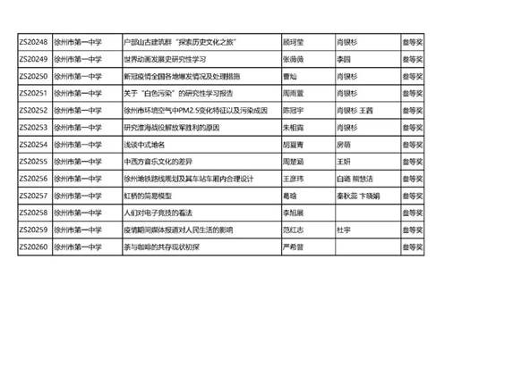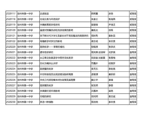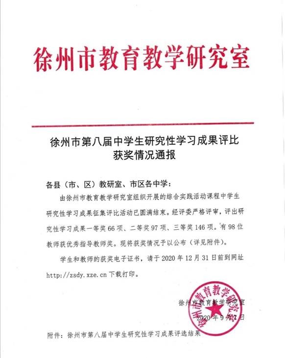 徐州市第八届中学生研究性学习成果评比结果揭晓,我校共获得9个一等奖,12个二等奖,41个三等奖的好成绩。向获奖同学与指导老师表示祝贺!