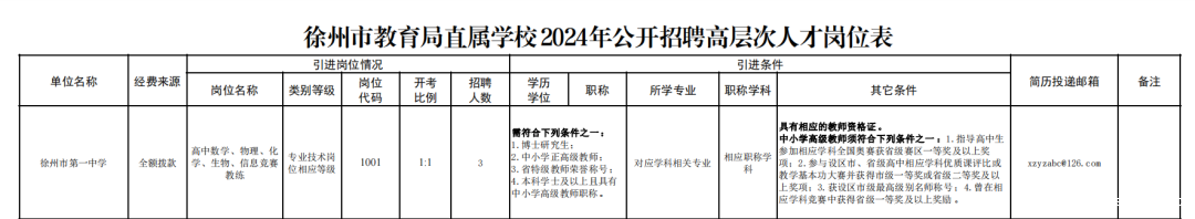 附件1:徐州市教育局直属学校2024年公开招聘高层次人才岗位表.xls