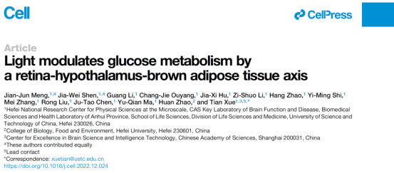薛天教授研究团队此次发表在Cell上的研究成果为:《光通过视网膜-下丘脑-棕色脂肪组织轴调控糖代谢》(Light modulates glucose metabolism by a retina-hypothalamus-brown adipose tissue axis) 。该工作发现了光直接通过激活视网膜上特殊的感光细胞,经视神经至下丘脑和延髓的系列神经核团传递信号,最终通过交感神经作用于外周的棕色脂肪组织,直接压抑了机体的血糖代谢能力。值得指出的是,这项工作不但在小鼠动物模型上系统回答了光调节血糖代谢的生物学机理,在人体试验上也发现了同样的现象,显示光调节血糖代谢可能广泛存在于哺乳动物界。