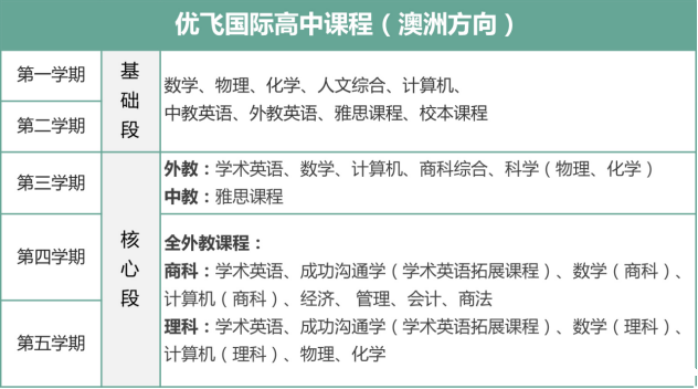 优飞国际课程包括普通高中基础课程、语言课程、一中校本课程以及国际课程。其中,国际课程主要包括英国、澳洲留学方向的新南威尔士大学预科课程;