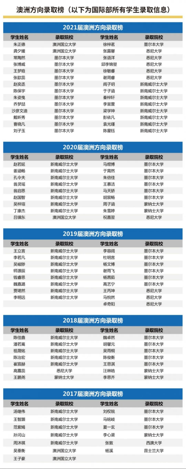 其中95%左右的学生被世界五十强的澳洲标志性五星大学(墨尔本大学、新南威尔士大学、悉尼大学和蒙纳士大学)本科段优先录取,其余5%的学生被英国、美国、加拿大名校和澳洲四星级大学本科段优录。